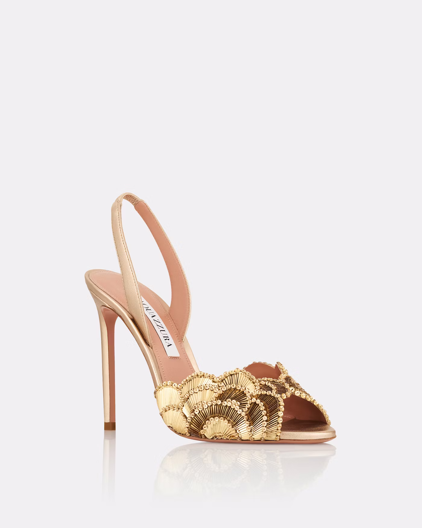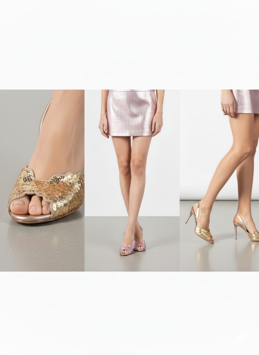 صندل نسائي ذهبي بكعب عالٍ بتصميم أنيق وتفاصيل لامعة، مزود بحزام خلفي مريح. مثالي للسهرات، المناسبات، والأعراس