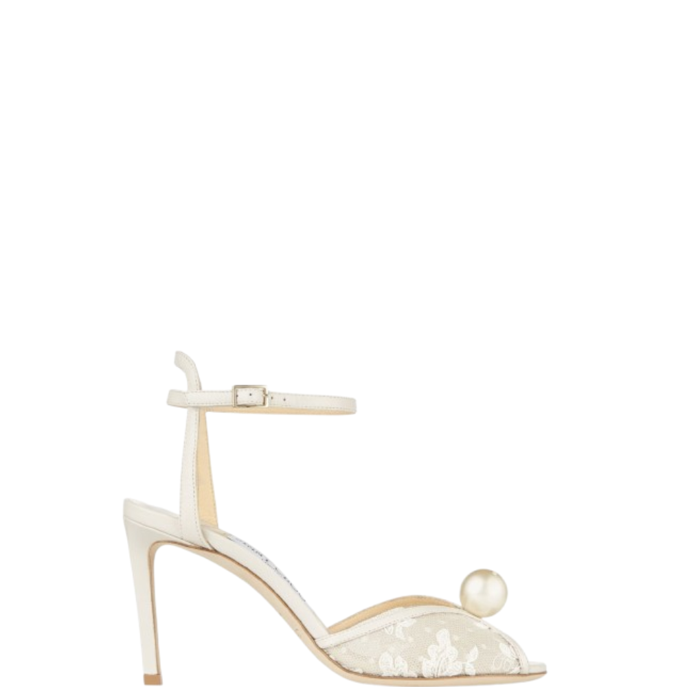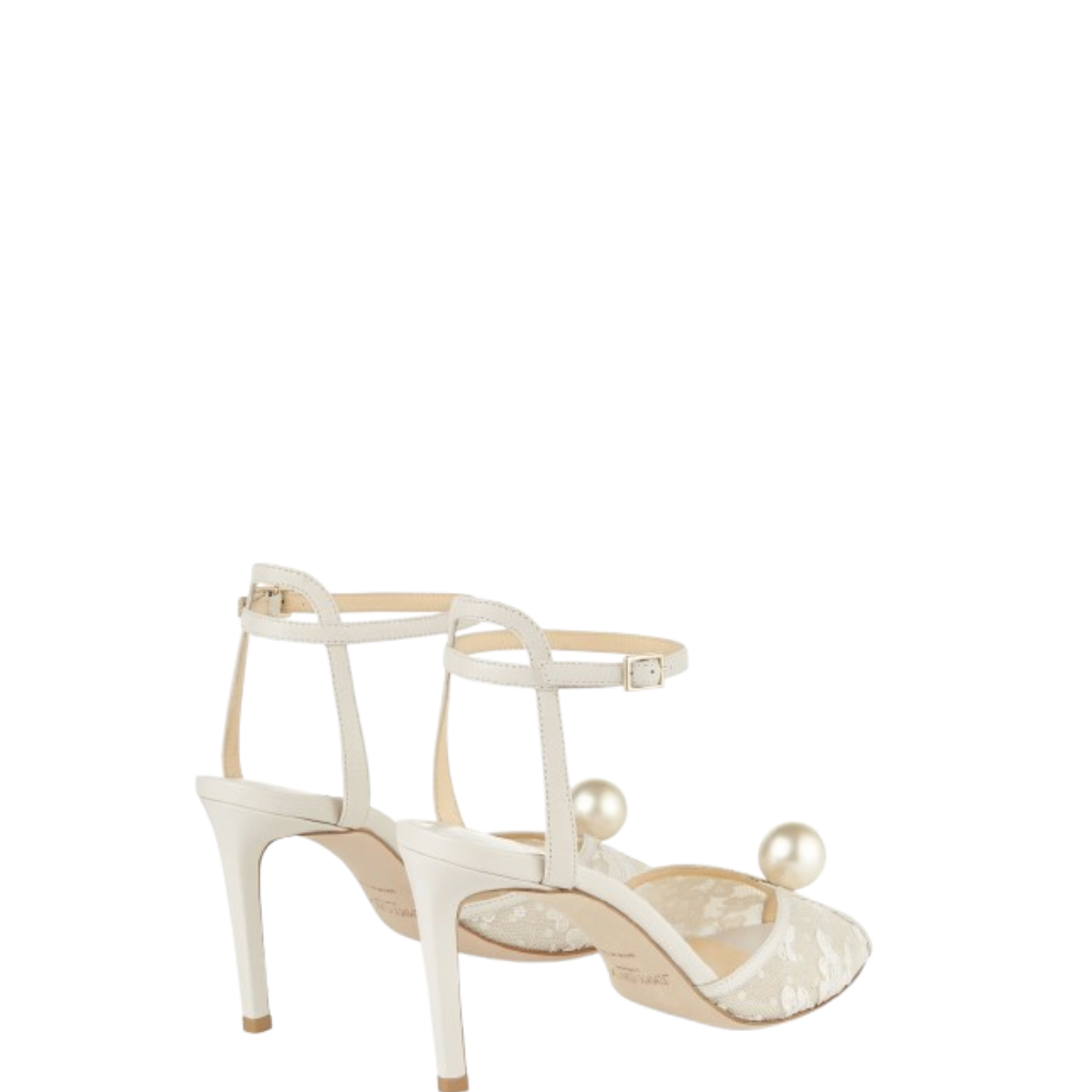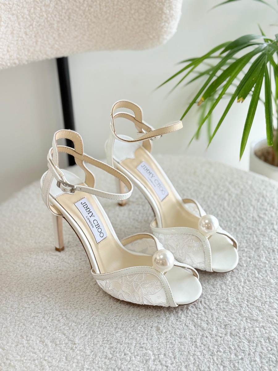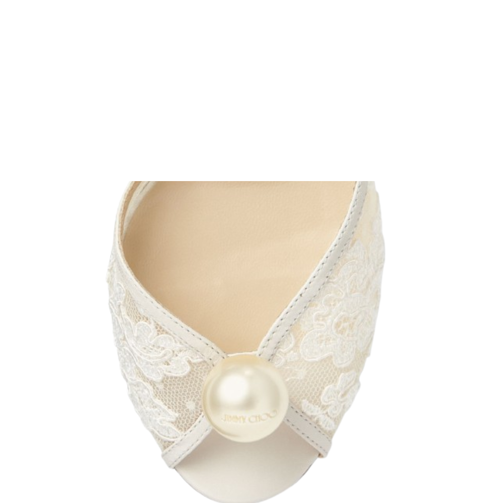 صندل Jimmy Choo الفاخر بالكعب العالي مع دانتيل أنيق ولمسة لؤلؤ ساحرة. مثالي للسهرات والأعراس مع تقييم 5 نجوم وأكثر من 320 عميلة سعيدة باقتنائه